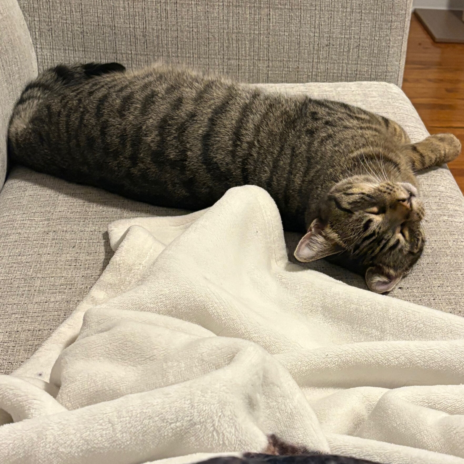 Speaking of cats, Goliath has been here since July too. He kinda runs things on the cat side of the building. He used to live at a shelter in Quebec but they couldn’t keep him anymore so our friend Becca who finds space for lots of other cats and dogs in need, made room for Goliath… and he needs a LOT of room. Goliath is a couch potato cat so he’d really like a bunch of pillows for his bed. If you can’t fit pillows onto the sleigh, he loves liver-flavoured treats. Just don’t give him the whole bag at once because he’ll definitely eat them all and then we’ll NEVER get him off the bed.